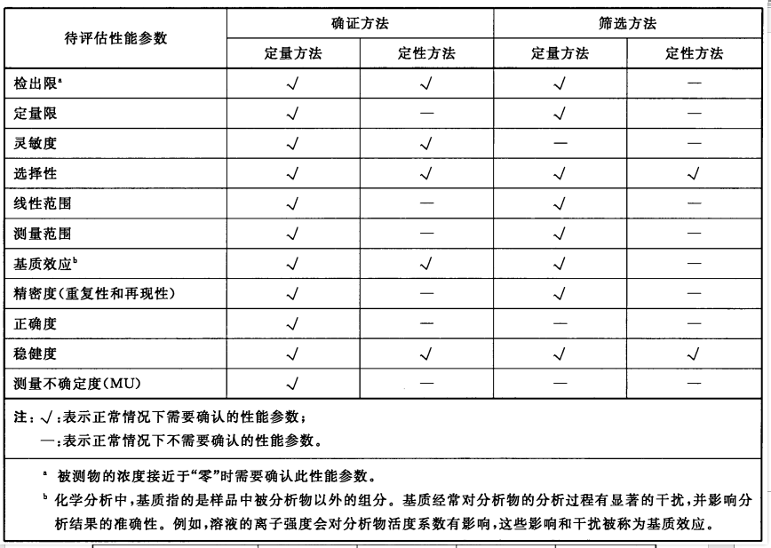 化學(xué)分析實驗室的小伙伴們,還在為如何做方法確認(rèn)或方法驗證而煩惱嗎?現(xiàn)在小迪很高興的告訴您,以后再也不用為此煩惱了!在今年的4月1日,由中國合格評定國家認(rèn)可中心、浙江出入境檢驗檢疫局和上海市計量測試技術(shù)研究院起草的GB/T27417-2017 《合格評定 化學(xué)分析方法確認(rèn)和驗證指南》正式發(fā)布了。本標(biāo)準(zhǔn)是實驗室對化學(xué)分析方法進(jìn)行方法確認(rèn)和方法驗證的指南性文件,旨在提高實驗室化學(xué)分析方法和檢測數(shù)據(jù)的質(zhì)量,確?;瘜W(xué)分析實驗室所提供數(shù)據(jù)的有效性、公正性和可靠性。想要申請CMA/CMAF資質(zhì)認(rèn)定、CNAS認(rèn)可、CATL認(rèn)可首次評審或者擴(kuò)項評審的小伙伴一定要認(rèn)真學(xué)習(xí)。下面我們就簡單通過以下兩個表來看看方法確認(rèn)和方法驗證分別需要做哪些參數(shù)。