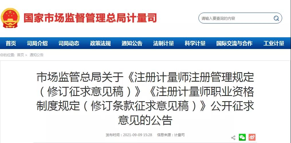 市場(chǎng)監(jiān)管總局關(guān)于《注冊(cè)計(jì)量師注冊(cè)管理規(guī)定(修訂征求意見稿)》《注冊(cè)計(jì)量師職業(yè)資格制度規(guī)定(修訂條款征求意見稿)》公開征求意見的公告
