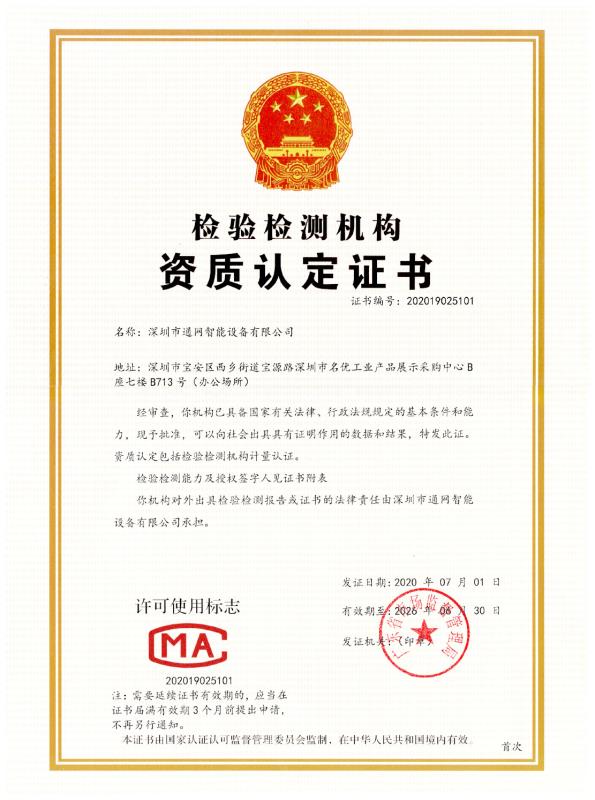 熱烈慶祝深圳市通網(wǎng)智能設備有限公司取得CMA資質認定證書