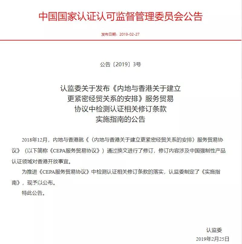 2018年12月,內(nèi)地與香港就《CEPA服務(wù)貿(mào)易協(xié)議》通過換文進(jìn)行了修訂。其中,將《CEPA服務(wù)貿(mào)易協(xié)議》附件1表2跨境服務(wù)開放措施(正面清單)1.商務(wù)服務(wù)F.其他商務(wù)服務(wù) e.技術(shù)測(cè)試和分析服務(wù)(CPC8676)及(CPC749)涵蓋的貨物檢驗(yàn)服務(wù)的“在強(qiáng)制性產(chǎn)品認(rèn)證(CCC)領(lǐng)域,允許經(jīng)香港特區(qū)政府認(rèn)可機(jī)構(gòu)(香港認(rèn)可處)認(rèn)可的具備內(nèi)地強(qiáng)制性產(chǎn)品認(rèn)證制度相關(guān)產(chǎn)品檢測(cè)能力的香港檢測(cè)機(jī)構(gòu),與內(nèi)地指定機(jī)構(gòu)開展合作,承擔(dān)在港設(shè)計(jì)定型且在廣東省加工或生產(chǎn)的音視頻設(shè)備類產(chǎn)品的CCC檢測(cè)任務(wù)”,修改為:“在強(qiáng)制性產(chǎn)品認(rèn)證(CCC)領(lǐng)域,允許經(jīng)香港特區(qū)政府認(rèn)可機(jī)構(gòu)(香港認(rèn)可處)認(rèn)可的具備內(nèi)地強(qiáng)制性產(chǎn)品認(rèn)證制度相關(guān)產(chǎn)品檢測(cè)能力的香港檢測(cè)機(jī)構(gòu),與內(nèi)地指定機(jī)構(gòu)開展合作,承擔(dān)在內(nèi)地加工或生產(chǎn)的CCC目錄內(nèi)所有產(chǎn)品的檢測(cè)任務(wù)。”經(jīng)修改的條款于2019年3月1日起實(shí)施。