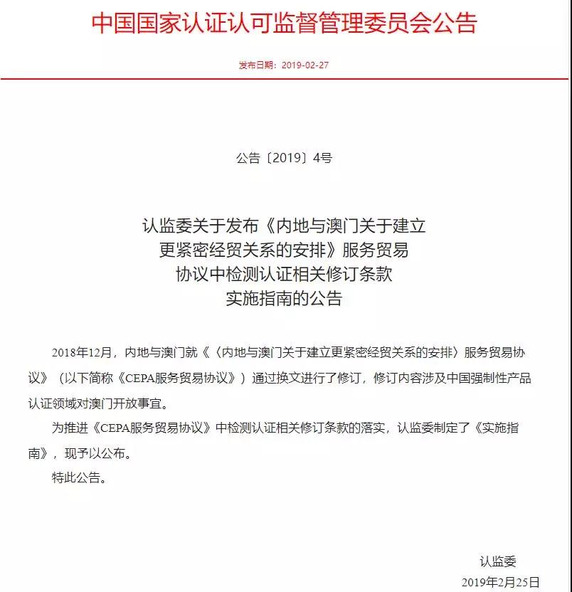 2018年12月,內(nèi)地與澳門就《CEPA服務(wù)貿(mào)易協(xié)議》通過換文進(jìn)行了修訂。其中,將《CEPA服務(wù)貿(mào)易協(xié)議》附件1表2跨境服務(wù)開放措施(正面清單)1.商務(wù)服務(wù)F.其他商務(wù)服務(wù) e.技術(shù)測(cè)試和分析服務(wù)(CPC8676)及(CPC749)涵蓋的貨物檢驗(yàn)服務(wù)的“在強(qiáng)制性產(chǎn)品認(rèn)證(CCC)領(lǐng)域,允許經(jīng)澳門特區(qū)政府認(rèn)可機(jī)構(gòu)認(rèn)可的具備內(nèi)地強(qiáng)制性產(chǎn)品認(rèn)證制度相關(guān)產(chǎn)品檢測(cè)能力的澳門檢測(cè)機(jī)構(gòu),與內(nèi)地指定機(jī)構(gòu)開展合作,承擔(dān)在澳設(shè)計(jì)定型且在廣東省加工或生產(chǎn)的音視頻設(shè)備類產(chǎn)品的CCC檢測(cè)任務(wù)”,修改為:“在強(qiáng)制性產(chǎn)品認(rèn)證(CCC)領(lǐng)域,允許經(jīng)澳門特區(qū)政府認(rèn)可機(jī)構(gòu)認(rèn)可的具備內(nèi)地強(qiáng)制性產(chǎn)品認(rèn)證制度相關(guān)產(chǎn)品檢測(cè)能力的澳門檢測(cè)機(jī)構(gòu),與內(nèi)地指定機(jī)構(gòu)開展合作,承擔(dān)在內(nèi)地加工或生產(chǎn)的CCC目錄內(nèi)所有產(chǎn)品的檢測(cè)任務(wù)?!苯?jīng)修改的條款于2019年3月1日起實(shí)施。