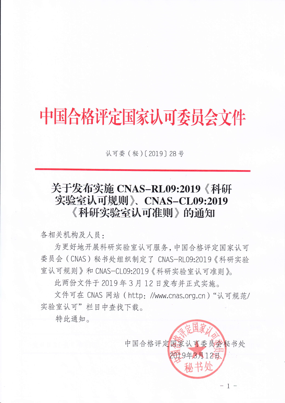 關(guān)于發(fā)布實施CNAS-RL09:2019《科研實驗室認可規(guī)則》、CNAS-CL09:2019《科研實驗室認可準(zhǔn)則》的通知