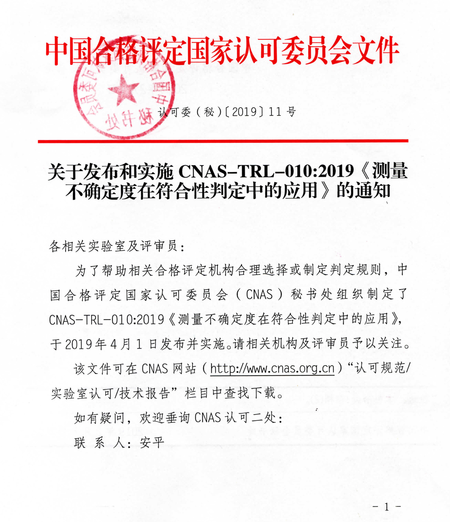 關(guān)于發(fā)布和實(shí)施CNAS-TRL-010:2019《測(cè)量不確定度在符合性判定中的應(yīng)用》的通知