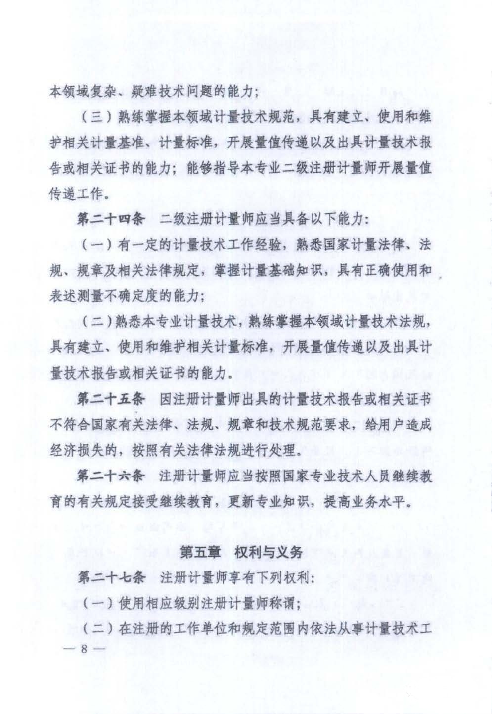 二是實(shí)行全國(guó)統(tǒng)一標(biāo)準(zhǔn),為人才順暢流動(dòng)提供保障。針對(duì)原來(lái)規(guī)定中二級(jí)注冊(cè)計(jì)量師合格標(biāo)準(zhǔn)由各地確定的問(wèn)題,明確職業(yè)資格考試成績(jī)合格分?jǐn)?shù)線由人力資源社會(huì)保障部會(huì)同市場(chǎng)監(jiān)管總局確定;將原規(guī)定中“二級(jí)注冊(cè)計(jì)量師資格考試合格,由地方人事行政部門頒發(fā)人事行政部門和市場(chǎng)監(jiān)管部門共同用印的《中華人民共和國(guó)二級(jí)注冊(cè)計(jì)量師資格證書(shū)》”修改為“市場(chǎng)監(jiān)管總局與人力資源社會(huì)保障部共同用印,在全國(guó)范圍內(nèi)有效”。這就實(shí)現(xiàn)了考試成績(jī)合格分?jǐn)?shù)線全國(guó)統(tǒng)一,發(fā)證機(jī)關(guān)全國(guó)統(tǒng)一,證書(shū)在全國(guó)范圍有效,為人才順暢流動(dòng)提供了保障。