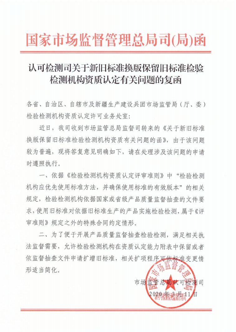 近日,我司收到市場監(jiān)管總局監(jiān)督司轉(zhuǎn)來的《關(guān)于新舊標(biāo)準(zhǔn)換版保留舊標(biāo)準(zhǔn)檢驗(yàn)檢測機(jī)構(gòu)資質(zhì)有關(guān)問題的函》,由于該問題較為普遍,現(xiàn)將答復(fù)意見明確如下,請?jiān)谔幚砩婕霸搯栴}的申請時(shí)遵照執(zhí)行?! ?/span>
