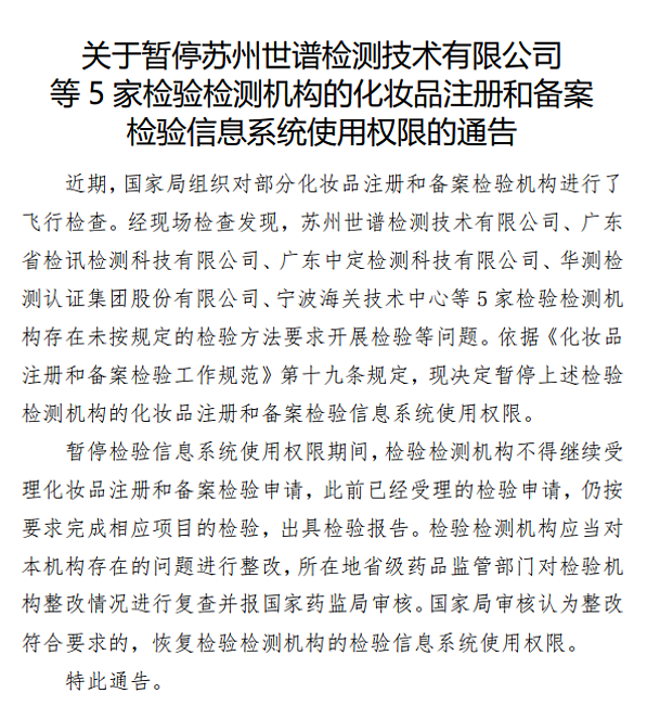 操作不規(guī)范!5家知名檢測(cè)機(jī)構(gòu)被暫?;瘖y品注冊(cè)和備案檢驗(yàn)系統(tǒng)使用權(quán)限