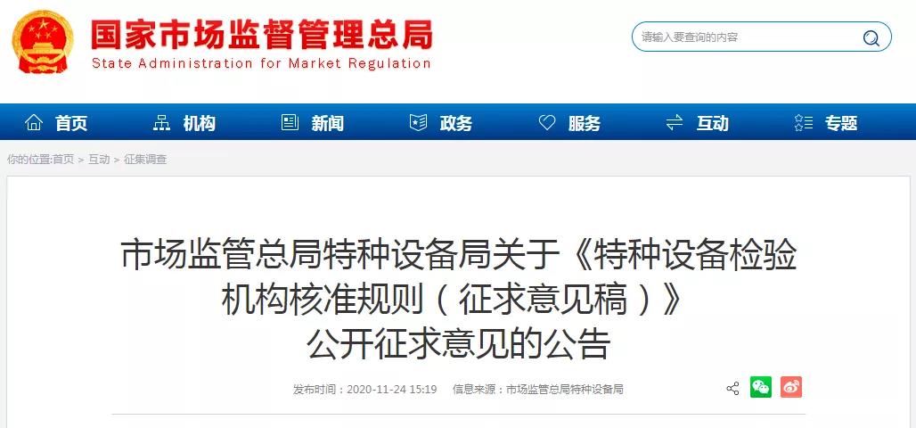 昨日,市場監(jiān)管總局官網(wǎng)發(fā)布公告,為進(jìn)一步規(guī)范特種設(shè)備檢驗(yàn)機(jī)構(gòu)的核準(zhǔn)工作,推動(dòng)特種設(shè)備檢驗(yàn)工作改革和特種設(shè)備行政許可改革,市場監(jiān)管總局組織起草了《特種設(shè)備檢驗(yàn)機(jī)構(gòu)核準(zhǔn)規(guī)則(征求意見稿)》(見附件),現(xiàn)向社會(huì)公開征求意見,意見反饋截止時(shí)間為2020年12月15日。