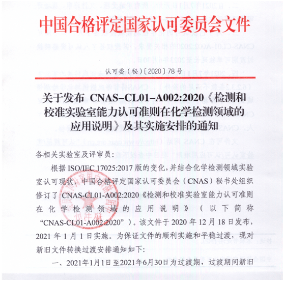 那是不是檢測領(lǐng)域新的應(yīng)用說明一發(fā)布實施就要馬上更新我們實驗室的管理體系文件呢?其實不然,每個檢測領(lǐng)域的應(yīng)用說明都會有個過渡期!拿化學(xué)檢測領(lǐng)域的例子來說吧,CNAS-CL01-A002:2020《檢測和校準實驗室能力認可準則在化學(xué)檢測領(lǐng)域的應(yīng)用說明》是2020年12月18日發(fā)布,2021年1月1日實施,但CNAS-CL01-A002:2018《檢測和校準實驗室能力認可準則在化學(xué)檢測領(lǐng)域的應(yīng)用說明》的廢止時間是2021年7月1日。2021年1月1日至2021年6月30日為過渡期,過渡期間新舊文件并行使用,實驗室自行完成過渡轉(zhuǎn)換即可。