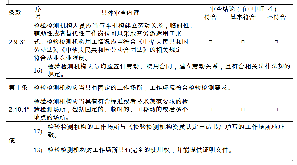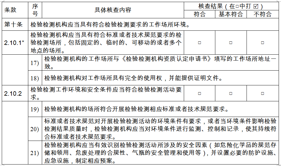 第十條 〔場(chǎng)所環(huán)境評(píng)審要求〕 檢驗(yàn)檢測(cè)機(jī)構(gòu)應(yīng)當(dāng)具有固定的工作場(chǎng)所,工作環(huán)境符合檢驗(yàn)檢測(cè)要求。