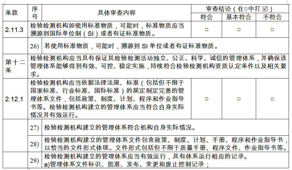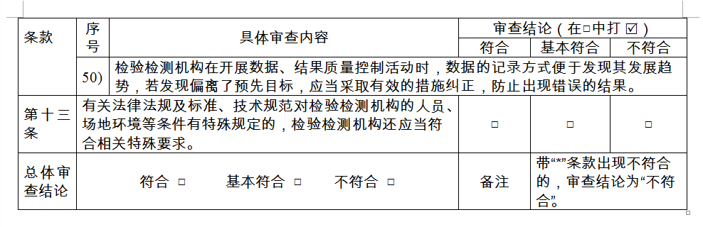 第十六條 〔書面審查適用情形與要求〕 書面審查方式適用于發(fā)生變更的事項(xiàng)不影響其符合資質(zhì)認(rèn)定條件和要求的變更評(píng)審和上一許可周期內(nèi)無違法違規(guī)行為、未列入失信名單且申請(qǐng)事項(xiàng)無實(shí)質(zhì)性變化的檢驗(yàn)檢測(cè)機(jī)構(gòu)的復(fù)查換證評(píng)審。對(duì)于符合資質(zhì)認(rèn)定要求的,簽署“符合”審查結(jié)論。