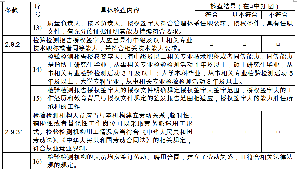 第九條 〔人員評(píng)審要求〕檢驗(yàn)檢測(cè)機(jī)構(gòu)應(yīng)當(dāng)具有與其從事檢驗(yàn)檢測(cè)活動(dòng)相適應(yīng)的檢驗(yàn)檢測(cè)技術(shù)人員和管理人員。