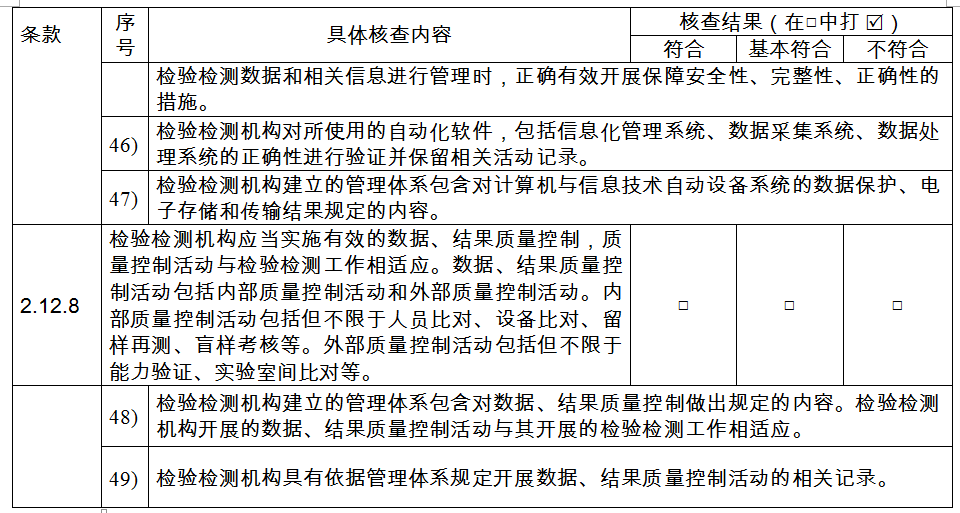 (八)檢驗(yàn)檢測(cè)機(jī)構(gòu)應(yīng)當(dāng)實(shí)施有效的數(shù)據(jù)結(jié)果質(zhì)量控制,質(zhì)量控制活動(dòng)與檢驗(yàn)檢測(cè)工作相適應(yīng)。數(shù)據(jù)結(jié)果質(zhì)量控制活動(dòng)包括內(nèi)部質(zhì)量控制活動(dòng)和外部質(zhì)量控制活動(dòng)。內(nèi)部質(zhì)量控制活動(dòng)包括但不限于人員比對(duì)、設(shè)備比對(duì)、留樣再測(cè)、盲樣考核等。外部質(zhì)量控制活動(dòng)包括但不限于能力驗(yàn)證、實(shí)驗(yàn)室間比對(duì)等。